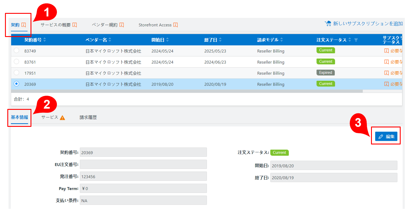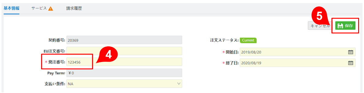【CSP】発注番号を変更したい <操作方法> 登録情報の変更について < h2> 操作方法> 登録情報の変更について> 発注番号は以下の手順で変更していただけます。 ① 該当契約の契約タブを選択 ② 基本情報タブを選択③ えんぴつマークをクリック ④ 発注番号を変更 ⑤ 💾をクリックして保存